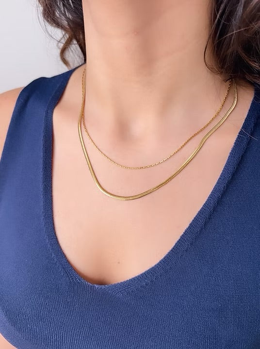 The combination of a flat snake chain and a super skinny chain offers a fashionable and contrasting layered necklace style. It's an excellent way to showcase your unique style and add a modern and chic element to your overall look.