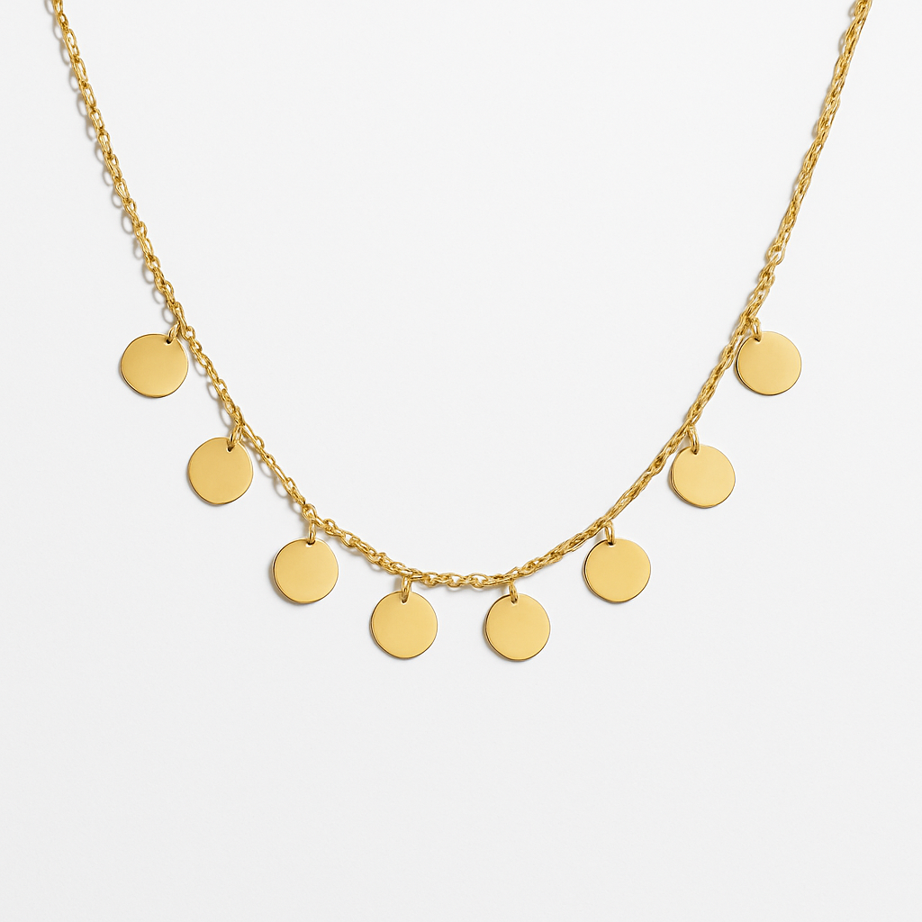 The DEMETER necklace features a delicately crafted circle pendant adorned with scattered charms, creating a sophisticated and contemporary statement piece. Its elegant design balances minimalist appeal with subtle detailing, making it versatile for both everyday wear and special occasions. Expertly crafted for durability and style, this necklace enhances your look with a refined touch.