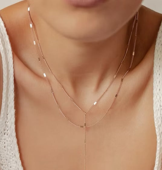 An adjustable V necklace great as a solo piece of it own. A necklace that will truly become your party-wear go to.