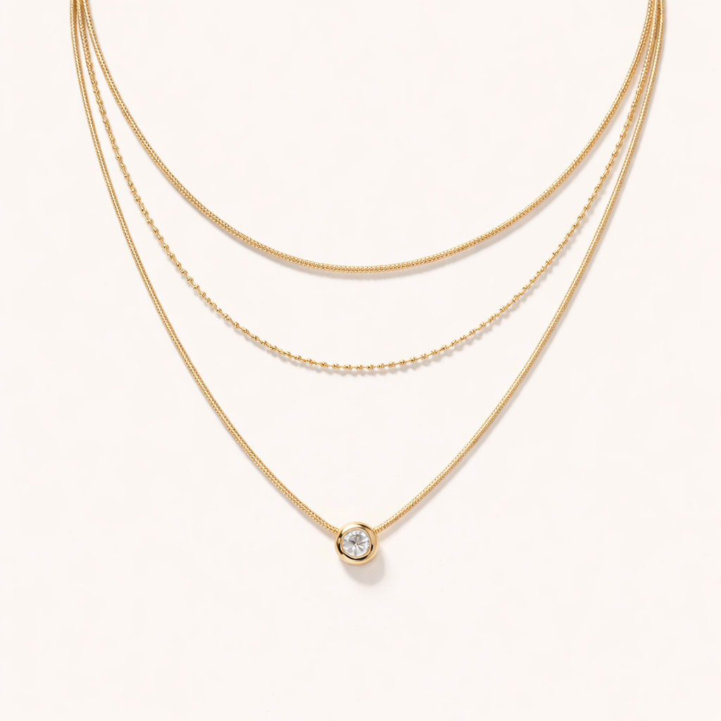 Add a touch of a dainty single stone beauty to your everyday style with this chic triple layered iliana pendant Necklace. Three differently layered chains adding a whole lot of dimension to a neckpiece that truly stands out. Minimal yet eye-catching. Showcase your individual style with this timeless accessory.