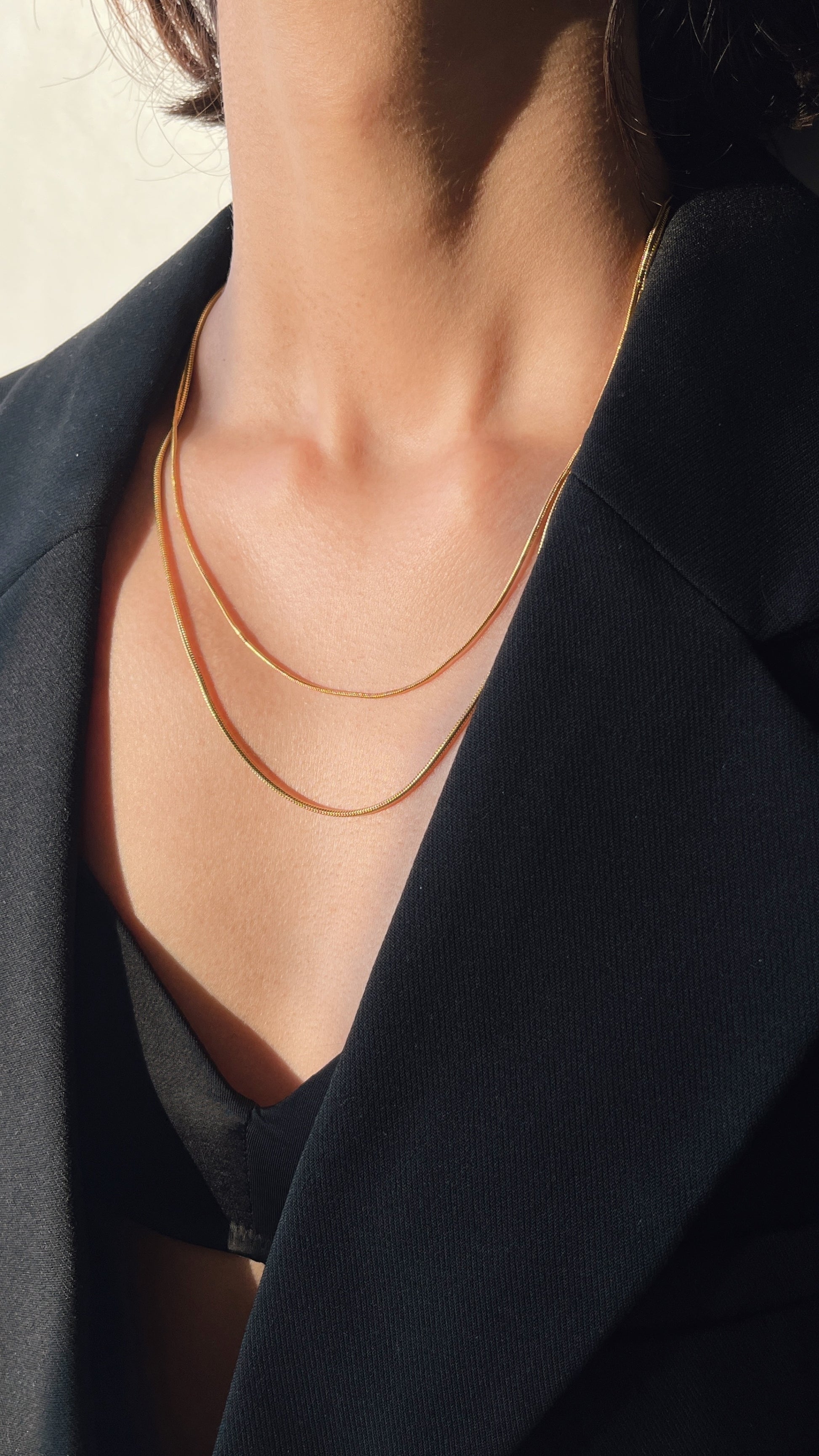 Two individual layered snake chains are a versatile accessory that complements a range of outfits, from casual to more dressy ensembles. Whether you're dressing up for a night out or adding flair to your everyday look, this set allows you to express your unique style.