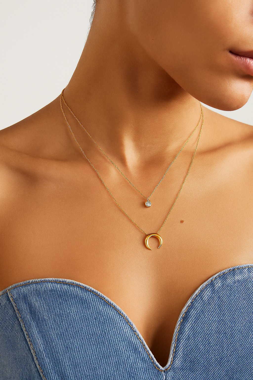 Add a touch of celestial beauty to your everyday style with this chic layered Moon Pendant Necklace. This necklace is minimal yet eye-catching. Showcase your individual style with this timeless accessory.