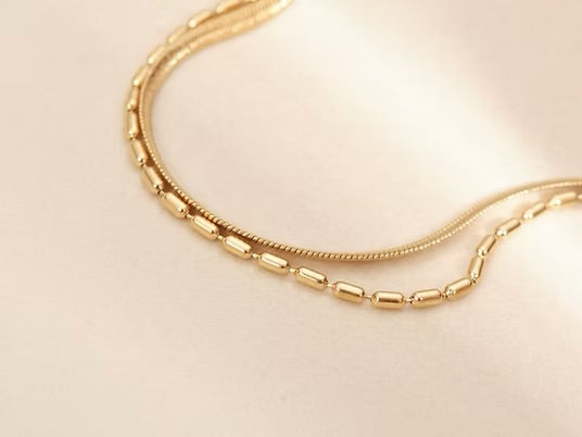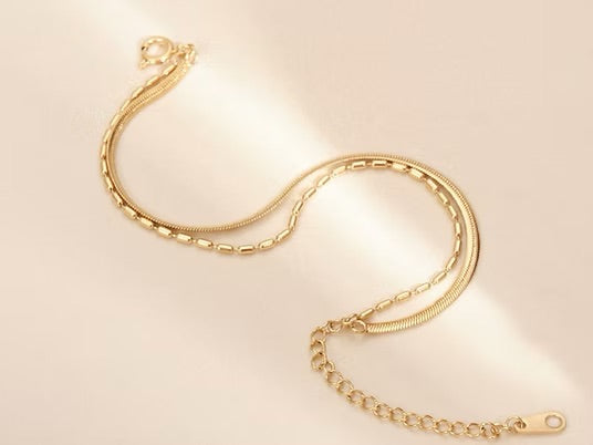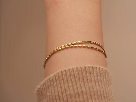 A double layered bracelet that is great for solo styling for casual wear and perfect for stacking with our cuff bracelets .